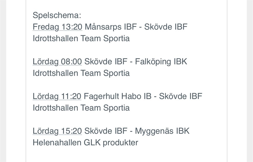 | Match mot Tibro IBK | 10 jan, 13:00 |