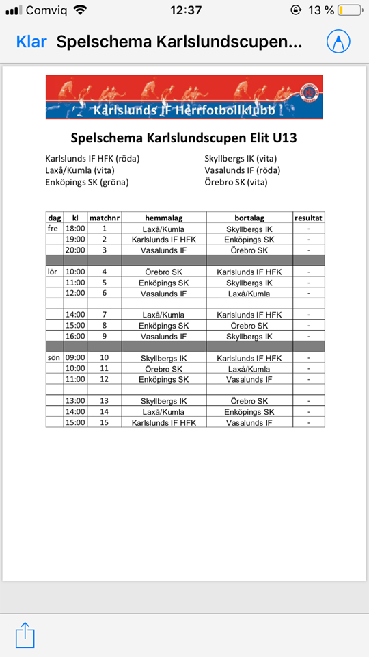 Samling kl 09:00 på vallen för ombyte innan vi åker. Med tag matsäck eller pengar då det är långt mellan matcherna Blå matchtröjan ska med Första match kl 10:40 ekäng IP Andra match kl 15:20 sörbyvallen Tredje match kl 18:40 sörbyvallen Samling vid planen 30min innan för uppvärmning. Söndagen: Morgondagens samling kl 9,20 ombytta och klara. Matchstart kl 10,40 på lugnets ip mot Mariestad. Vid vinst så blir det fortsatt spel och kan bli en lång dag så matsäck eller pengar medtages även den BLÅ MATCHTRÖJAN ska med. Vid förlust så är det färdigspelat.