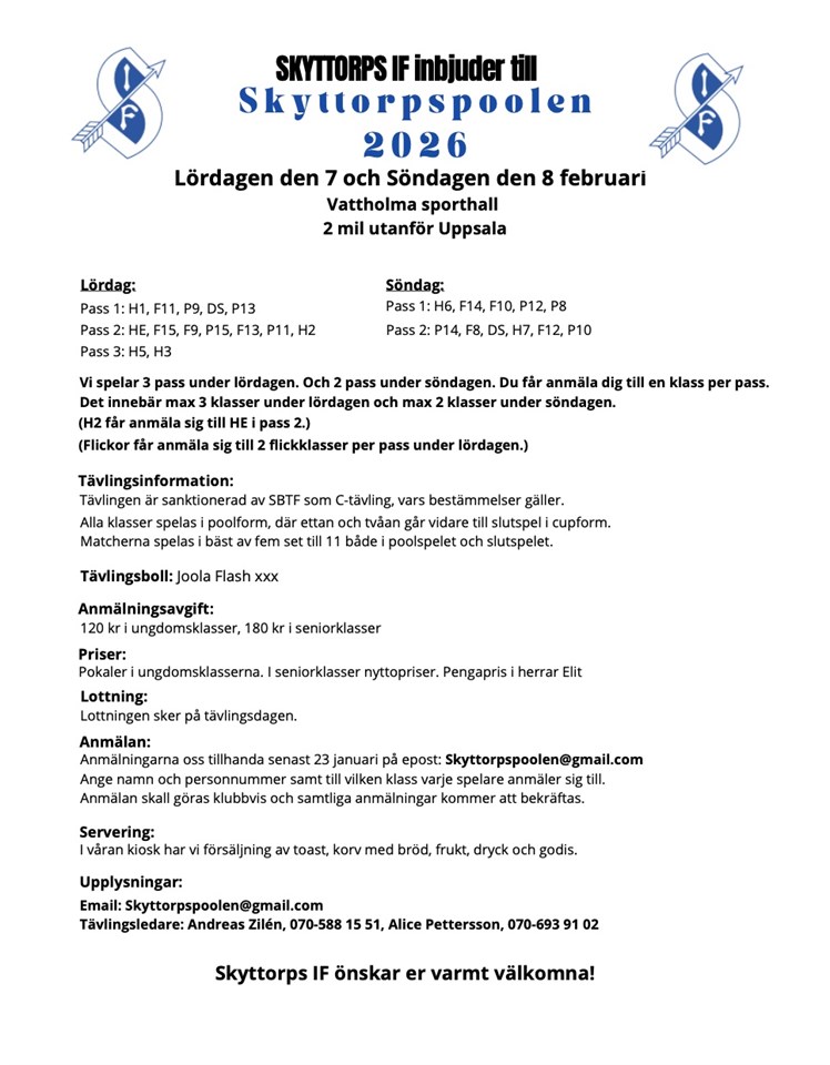 Äntligen har pingissäsongen dragit igång på riktigt! Vi är glada att meddela att vi i helgen har tre lag som tävlar. Div 7 hemma i skyttorp på lördag Div 4 i Uppsala på lördag Div 6 i Heby på söndag Vi önskar våra fantastiska spelare lycka till! Ge järnet och ha kul där ute!