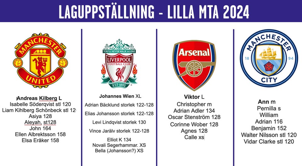 Så här ser lagen ut på lördag, i Lilla MTA-cupen som pågår kl. 10.00 - 12.00 AGENDA: • Kom i god tid! Senast en halvtimme före start • Anmälningsavgift: 50 kr, betalas i kiosken vid ankomst. Biljetten man får behåller man och visar upp för att erhålla sin t-shirt samt korv och dricka. • Avspark för de första matcherna i Lilla MTA sker exakt kl. 10.00 Vi hoppas på mycket publik, bra väder och en härlig stämning på lördag! Tillsammans hjälps vi åt att göra även detta året till en minnesvärd och rolig dag för alla inblandade! Välkomna till Slöinge IP den 29/6! // Hälsar Ann, Ogge & Tobbe