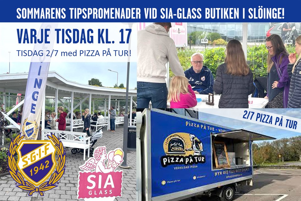 Välkomna på tipspromenad tis 2/7. Start vid SIA glassbutiken från kl 17.00-18.30 Denna gången finns även Pizza på Tur på plats vid Sia-glass butiken med sina goda vedeldade pizzor, så kom hit och ta dig en en rykande färsk kvällsmat efter promenaden! • Ca 30 minuters promenad i samhället • Vuxenfrågor, barnfrågor och Trimbingo • 40 kr vuxen och 20 kr barn, 10 kr Bingo Vinnarna meddelas här på hemsidan, på anslagstavlan vid Matöppet och i våra sociala medier och vinsterna hämtas ut i SIA-glass butiken under deras ord. öppettider. VARMT VÄLKOMNA! Slöinge GoIF - i samarbete med SIA Glass Övriga tipspromenader vid SIA glassbutiken: 9/7 Tisdag 16/7 Tisdag 23/7 Tisdag 30/7 Tisdag Målgång senast 19.30 vid samtliga promenader