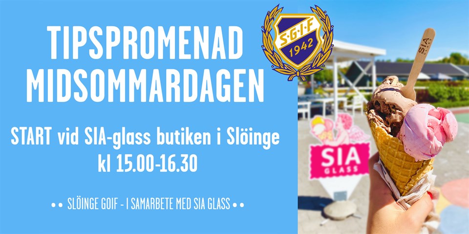 Sommarens första TIPSPROMENAD går av stapeln på Midsommardagen 22/6 - Start kl. 15.00-16.30. med start vid SIA-glass butiken i Slöinge. • Ca 30 minuters promenad i samhället • Vuxenfrågor, barnfrågor och Trimbingo • 40 kr vuxen och 20 kr barn, 10 kr Bingo Vinnarna meddelas här på hemsidan, på anslagstavlan vid Matöppet och i våra sociala medier och vinsterna hämtas ut i SIA-glass butiken under deras ord. Öppettider. VARMT VÄLKOMNA! Slöinge GoIF - i samarbete med SIA Glass Övriga tipspromenader vid SIA glassbutiken: 25/6 Tisdag - Start kl. 17.00-18.30. 2/7 Tisdag - Start kl. 17.00-18.30. 9/7 Tisdag - Start kl. 17.00-18.30. 16/7 Tisdag - Start kl. 17.00-18.30. 23/7 Tisdag - Start kl. 17.00-18.30. 30/7 Tisdag - Start kl. 17.00-18.30. Målgång senast 19.30 vid samtliga promenader Slöinge GoIF 18 jun 2024 0kommentarer