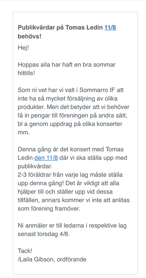 Hej! Hoppas ni njuter av sommarledigheten. Det har blivit lite ändringar och nästa poolspel är 21/8 då vi kommer vara arrangörer. Vi kommer behöva hjälp med kaféet precis som förra gången samt några föräldrar som kan turas om att ha en gul väst och därmed nycklar till omklädningsrum. Hör gärna av er om ni kan tänka er att stå i cafet. Vi återkommer med tider m.m när det närmar sig. P12 26 jul 2022 6kommentarer
