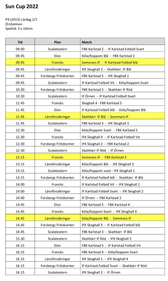 Matchtider för Sun Cup. Samling 0900 vid kiosken på Örsholmen. Ta med benskydd, skor, vattenflaska solskydd och badkläder 😎. P12 22 jun 2022 2kommentarer