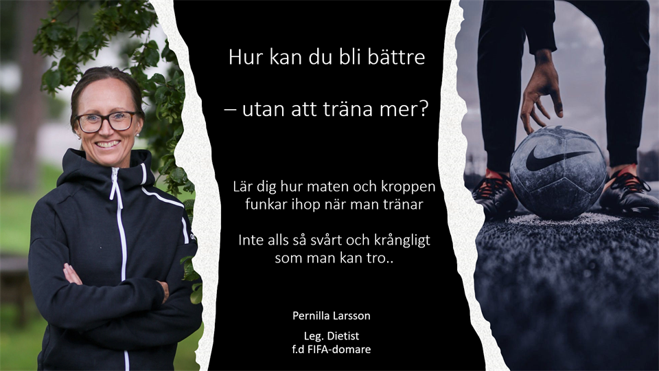 Välkomna på föreläsning! Kostföreläsning låter oftast tråkigt och svårt, men det måste inte vara så. Tänk att kunna bli bättre utan att ens behöva träna mer. Genom att på ett lättförståeligt sätt få lite bättre koll på hur kroppen och maten funkar ihop och hur kroppen funkar när vi tränar, kan man maxa sin prestation. Pernilla Larsson är leg. Dietist och även f.d FIFA-domare i fotboll med 20 års erfarenhet av att jobba med kost och idrott på olika nivåer och runtom i Sverige. ” När? : Tisdag 13 september 18.30 Var?: Varekilsskolans matsal. För vem?: Målgrupp spelare senior, ledare och föräldrar. Föreläsningen håller på i 90 min inkl bensträckare.