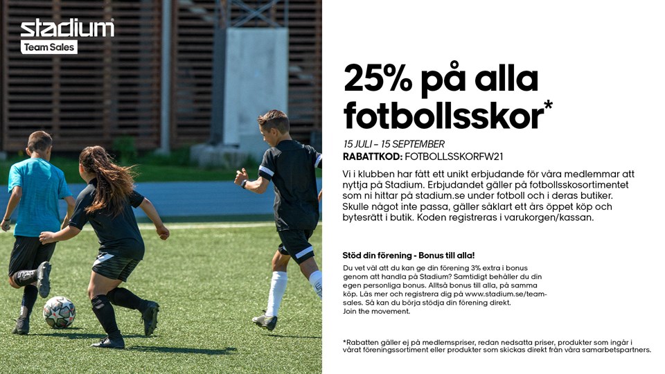 Vår samarbetspartner Stadium erbjuder just nu fina rabatter på fotbollsskor. Du vet väl att du även kan köpa Stala-träningskläder via sidan? Fel webbadress i texten, skall vara utan bindestreck https://www.stadium.se/teamsales/