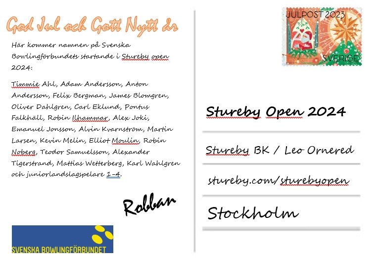 Vi i Stureby är stolta att presentera ett samarbete med Svenska Bowlingförbundet där Team Sweden kommer representeras av spelare från U18, U21 och Team Sweden herr. Sturebys målsättning är att skapa en av Sveriges bättre open tävlingar och då behöver vi Sveriges bästa bowlare, är du en av dem? Missa inte chansen att visa det genom att delta i första upplagan av Stureby Open! Anmälan öppnar 1/1-2024. Redan nu kan du göra en intresseanmälan HÄR. God Jul och Gott Nytt år Ses i Stockholm!