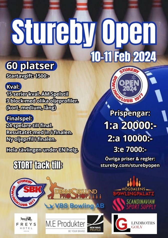 Här är alla Stureby Opens samarbetspartners Stureby BK, arrangörsförening Lindroths golv, levererar alla delar i golventrepenad Högdalens Bowlingpalatz, hallen för Stureby Open Dennis Eklund Proshop, hallens proshop VBS Bowling, din ledande bowlingleverantör Freys hotels, spelarhotellet centralt i Stockholm M.E Produkter, profilprodukter med tryck Scandinavian Sport Supply, banoljor, tvättmedel och klotrengöring Ett nytänkande i skapande av bowlingtävling -med fokus på det sportsliga- - hela tävlingen under EN helg. - 15 serier kval i tre block med olika oljeprofiler (kort,medium,lång) - 24 till final utav 60 med ny oljeprofil - Resultatet med in i finalen ANMÄLAN ÖPPNAR 1.1.2024 kl 15.00