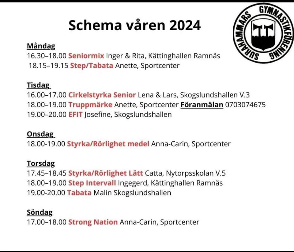 Idag startar nästan alla våra gruppträningspass enligt schema (se bild) Du tränar efter egen förmåga, ingen föranmälan krävs utan det är bara att droppa in. Välkomna att träna med oss! GRUPPTRÄNING VUXEN 8 jan 2024 1kommentar