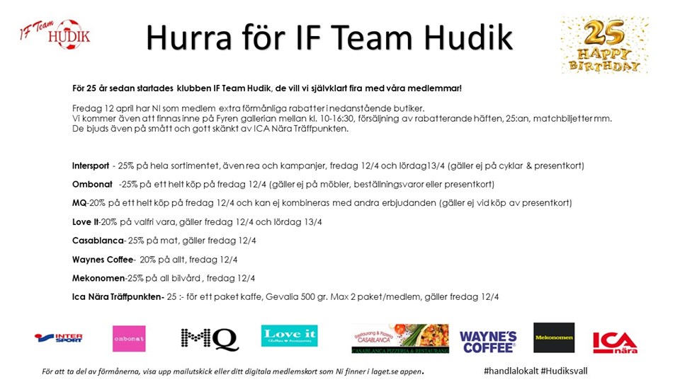 Nu är IF Team Hudiks shop öppen! Behöver ni beställa klubboverall, shorts, strumpor, väskor mm inför säsongen ? Gå in på teamhudik.se i det högra hörnet finner ni IF Team Hudik webbshop till bra klubbpriser, eller så klickar ni här . Klicka in, beställ och betala på nätet. Varorna hämtas inne på Intersport butiken. Vill ni prova, eller känna på kvalitén går ni in på Intersport så finns våra varor där. Skor finns inte i webbshopen utan de får ni prova och handla i butiken. Vid frågor kontakta Ulf Sundfors på Intersport eller Lotta på kansliet, 072-183 94 94 eller ifteamhudik@teamhudik.se