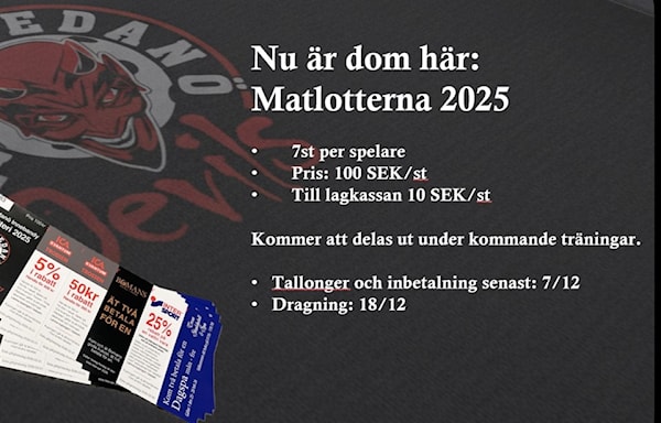 Jag kommer att börja dela ut matlotterna under söndagens träning. I och med det ekonomiska värdet så kommer lotterna inte att lämnas till barnen, utan enbart till er föräldrar. Ta kontakt med mig när ni hämtar eller lämnar.