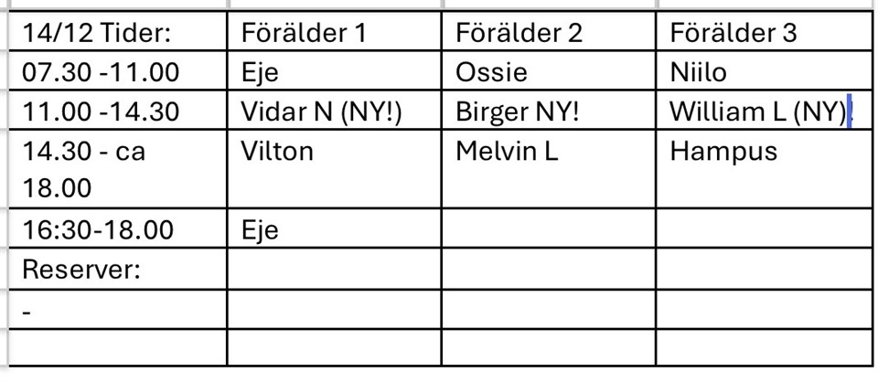 Här kommer kioskschema för 14/12. Säg till snarast om ni inte kan, om någon schemalagd meddelar att man inte kan så förutsätter vi att en reserv räcker upp handen :) Ni som är med i schemat får gärna kommentera så att vi vet att alla sett.