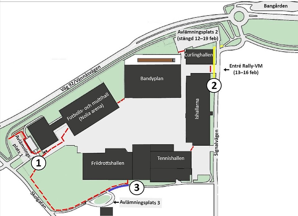 Förberedelser inför Rallyveckan pågår vid Nolia ishall under helgen. Kom i tid! Då det är lite längre promenad från parkering till omklädningsrum än vanligt. Det är parkeringsförbud på stora ytan, Noliaområdets insida - där man vanligtvis parkerar. Detta gäller på söndag. Söndag 9/2 Tillfällig entré via Signalvägen - nummer 2 på kartan Finns en plogad gångväg för fotgängare längs med kortsidan av curlinghallen (se gul markering på karta). Du som behöver en parkeringsplats hänvisas till Bangårdens gratisparkering. TRIXA Hockeyskola 4 feb 2025