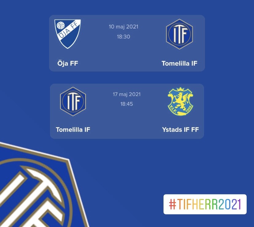 Imorgon är det äntligen dags för årets första match för våra änglar och som vi har längtat!! Matchen spelas mot Öja FF och hemmalaget kommer att sända matchen via appen Min fotboll för er som är intresserade av detta. 29 enkronor kostar det och länken finns här nedan. Truppen mot Öja FF: 7 Qader Akbari 8 Gustav Jönsson 10 Erik Ekholm 12 Edrin Avdullahu 14 Oscar Håkansson 15 Leo Björklund 17 Eros Gerbavci 20 Max Jansson 22 Adam Leufstedt 24 Anton Högström 26 Tage Stålhammar 29 Amadeus Persson 31 Hugo Olsson Öja FF - Tomelilla IF herr https://minfotboll.app.link/ygwRqMY16fb