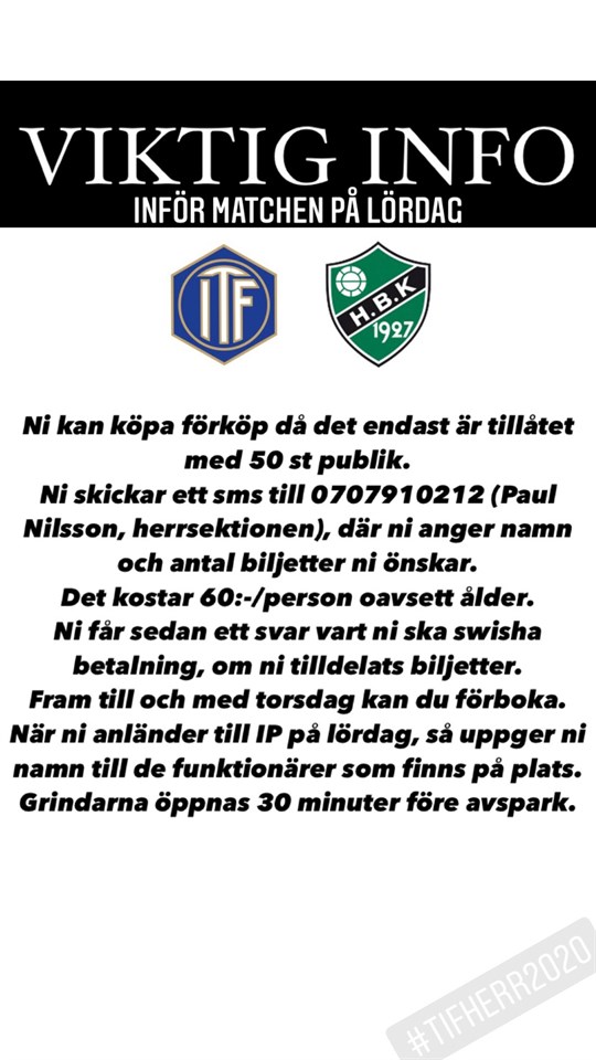Nu ikväll är det dags för en ny livesändning som ni alla vet. Länken till kvällens match ligger redan på hemsidan. Lördagen den 27/6 har A-laget hemmapremiär och den matchen kommer också att sändas live via appen Min fotboll. Länken till den matchen får ni när det börjar närma sig. Tyvärr undanbedes all publik på IP vid båda matcherna. TIF kommer missa intäkter från entré- och kioskförsäljning, så därför är vi tacksamma om ni stöttar TIF genom att köpa virtuella biljetter via swish. Varje bidrag är till stor hjälp för vår fina förening. Stort tack för ditt stöd!