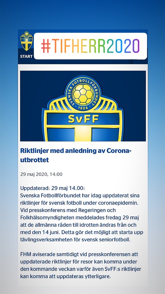Information som vi tidigare idag fick av Svenska fotbollsförbundet: Riktlinjer med anledning av Corona-utbrottet Uppdaterad: 29 maj 14.00: Svenska Fotbollförbundet har idag uppdaterat sina riktlinjer för svensk fotboll under coronaepidemin. Vid presskonferens med Regeringen och Folkhälsomyndigheten meddelades fredag 29 maj att de allmänna råden till idrotten ändras från och med den 14 juni. Detta gör det möjligt att starta upp tävlingsverksamheten för svensk seniorfotboll. FHM aviserade samtidigt vid presskonferensen att uppdaterade riktlinjer för resor kan komma under den kommande veckan varför även SvFF:s riktlinjer kan komma att uppdateras ytterligare. Coronautbrottet innebär stora påfrestningar på vårt samhälle. Svensk fotboll har ett ansvar att bidra till att konsekvenserna blir så hanterbara som möjligt och att så få som möjligt drabbas. SvFF har därför tagit fram riktlinjer och rekommendationer till stöd för föreningar, distriktsförbund och andra berörda parter. Vårt förhållningssätt i rådande läge är att anpassa vår verksamhet och vidta de åtgärder som situationen kräver. De beslut vi tar baserar vi på den information som finns tillgänglig, och på regeringens och ansvariga myndigheters direktiv. Samtidigt är vi medvetna om att situationen förändras hela tiden och att vi kan behöva ompröva ställningstaganden. Behovet av att minimera risken för smittspridning får betydande påverkan på tävlingsverksamheten över hela landet. Hälsan kommer i alla lägen först – det har varit utgångspunkten både för de beslut som styrelsen fattat gällande SvFF:s tävlingar, och för de rekommendationer man har tagit fram till distriktsförbunden avseende distriktens tävlingar. Samtidigt är det viktigt att den lokala verksamhet som ändå kan bedrivas fortsätter – det är också av betydelse för folkhälsan. SvFF har tagit fram riktlinjer och rekommendationer som alla delar av fotbollsrörelsen bör förhålla sig till. Vi tror att dessa kan vara ett bra stöd som gör det enklare för föreningarna att ta hand om sin verksamhet och fatta beslut i en utmanande tid. Alla måste dock vara införstådda med att läget kan skifta snabbt – nya beslut från myndigheter kan komma, situationen kan både förvärras och förbättras. Dessa rekommendationer och riktlinjer kan därför behöva uppdateras (i princip bör man utgå från att detta kommer att hända). Om så sker kommer SvFF meddela alla berörda på snabbast möjliga vis.
