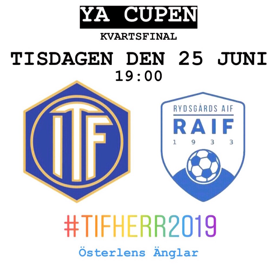 Dags för kvartsfinal i YA-cupen och vi fick hemmaplan i kvartsfinalen vilket är alldeles underbart och motståndare är Rydsgårds AIF som spelar i division 4 vilket innebär en straff till RAIF som de får lägga när de önskar. Många av våra ungdomslag förväntas vara på plats och vi hoppas att Du kommer dit! Väderprognosen säger strax över 20 grader kl.19.00, så fina förutsättningar. Vi ses på tisdag!! Truppen: 21 Filip Malmqvist 2 Johan Nilsson 3 Anton Olofsson 5 Tobbe Andersson 7 Crille Persson 8 Hampus Nilsson 9 Ahmed Zukanovic 10 Joakim Persson 11 Hugo Hellichius 12 Johannes Persson 15 Linus Göransson 16 Adam Jönsson 18 Kasper Svensson 19 Jesper Larsson 20 Erik Ekholm 22 Jakob Wetterberg