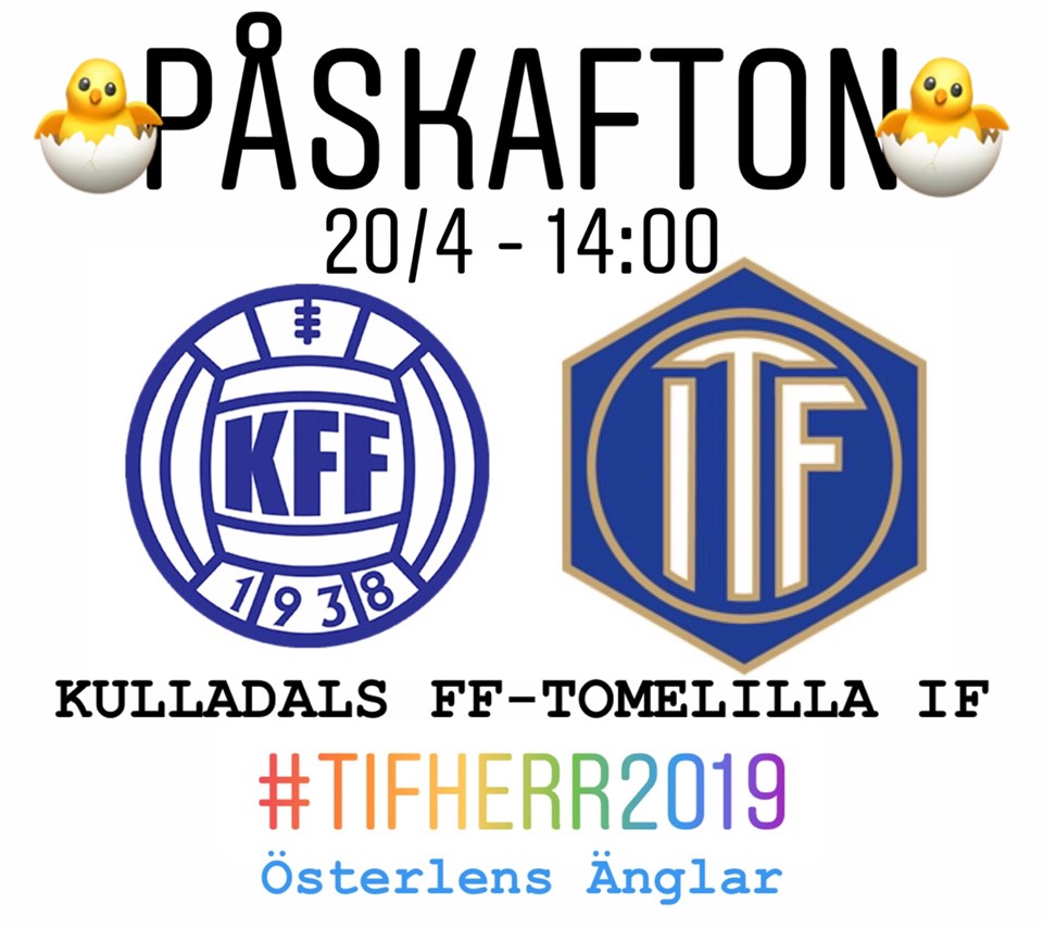 Dags för årets första bortamatch och vi ska gästa Kulladals FF på deras fina idrottsplats på självaste påskafton. Vi går som alltid för tre poäng, men vi förväntar hos ett hungrigt KFF då de förlorade i första omgången. Resultat säsong 2018: TIF-Kulladals FF 0-1 Kulladals FF-TIF 1-4 Truppen 31 André Jeppsson 21 Filip Malmqvist 2 Johan Nilsson 3 Anton Olofsson 4 Alexander Larsson 5 Tobias Andersson 6 Anders Nilsson 7 Jakob Wetterberg 8 Hampus Nilsson 9 Ahmed Zukanovic 10 Joakim Persson 11 Jesper Larsson 12 Johannes Persson 14 Hugo Hellichius 15 Linus Göransson 16 Adam Jönsson 17 Alisina Hussein 18 Felix Mattsson