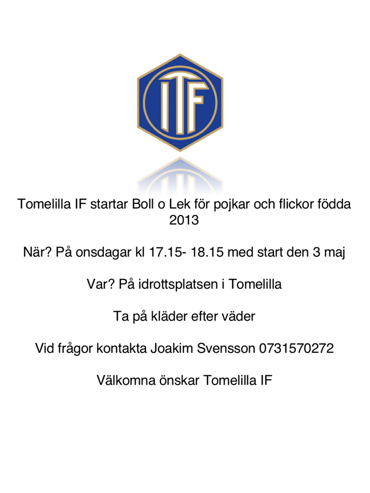 Tomelilla IF startar boll o lek för pojkar och flickor födda 2013 När? På onsdagar kl 17.15- 18.15 med start den 3 maj Var? På idrottsplatsen i Tomelilla Ta på kläder efter väder Vid frågor kontakta Joakim Svensson 0731570272 Välkomna önskar Tomelilla IF P13/14 – 2011/2012 27 apr 2017 0kommentarer