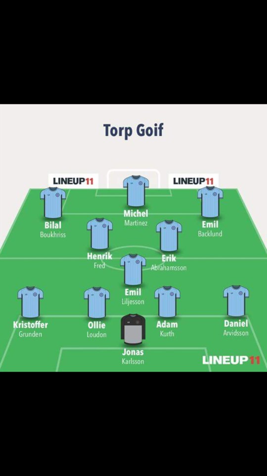 Svenshögen/ÖIK 1 – 2 Torp GOIF Sent omsider kommer referatet från måndagens match. Vi begav oss får årets andra match mot Svenshögen, efter att ha mött dem i en träningsmatch under försäsongen, som då slutade med en 2-1 seger till våra motståndare. Det vi kunde ta med oss från den matchen var att deras spelidé gick ut på att via långa uppspel hitta någon av deras tre anfallare. Startelvan finner ni i bilden ovan, och avbytarna för dagen var: Simon Karlsson, Michel Martinez, Jimmy Ekström-Skoog, Peter Andersson och Fredrik Johansson. Vi valde under matchen att prova ett nytt spelsystem, med målsättningen att ha en bättre och tryggare uppspelsfas och således ge oss mer trygghet med bollen. I början på matchen hamnade vi lite fel i våra positioner i försvarsspelet, vilket ledde till att våra motståndare kom fram till två farliga frilägen, som dock Joppe på ett mycket bra sätt kunde avfärda. Vi gjorde då en liten förändring genom att flytta ned vår defensiva mittfältare något, vilket gav oss bättre kontroll. Under första halvlek är det jämnt, men ju längre tiden går desto mer tar vi över matchen och kommer också till ett par bra lägen efter fint kombinationsspel mellan innermittfältare, yttermittfältare och anfallare. Dock inget som resulterar i mål, således står sig 0-0 till halvlek. Vi pratar i halvlek om att fortsätta trycka på som vi gjort och spela vårt spel. Även andra halvlek börjar bra och vi styr matchen på ett bra sätt, och Svenshögen kommer inte till några direkt farliga chanser. Istället kommer vi till ett par bra chanser, bland annat Michel som kommit in kommer till ett farligt friläge som deras målvakt lyckas rädda. Dock i 75e minuten lyckas vi göra 0-1 efter ett fint anfall som började med inspark från Joppe, en klack från Peter över Svenshögens mittfält, därefter en styrning från Backlund över deras backlinjen där Bilal kommer i en perfekt löpning och kan chippa in 0-1. Vi blir direkt efter målet lite avvaktande, men det resulterar inte i några konkreta lägen från Svenshögen. Dock när matchen står och väger kommer Backlund fri med Svenshögens målvakt och kan placera in 0-2 i den 86e minuten. Det slutar dock inte där, efter lite slarv i försvarsspelet får Svenshögen en frispark, där de lyckas trycka in 1-2 efter lite koncentrationsmiss i markeringen. Dock blir det inte mer än så, utan första segern för år är ett faktum. Vi spelar stundtals väldigt bra, både gällande anfallsspelet och försvarsspelet, och enligt min (om än partiska) åsikt är det rättvist att vi står som segrare. Matchens lirare går till: 3p: Bilal Boukhriss. 2p: Jonas ”Joppe” Karlsson. 1p: Emil Backlund. Nu återstår två matcher innan sommaruppehållet. Nästa match är söndag 16/6 hemma mot Stensungsunds IF lag 3. Ha det gott, Häger