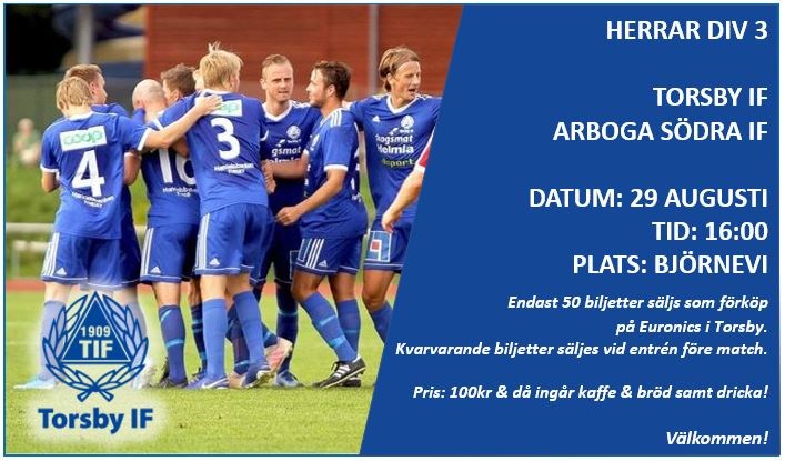 A-lag herrar Förköp till DM & Seriematchen för herrarna denna veckan! Kvartsfinal Stora DM Onsdag 26/8 kl. 18.30 TORSBY IF - NORDVÄRMLAND FF Herr div. 3 Lördag 29/8 kl. 16.00 TORSBY IF - ARBOGA S:A Biljetterna säljs som förköp på Euronics i Torsby Endast 50 biljetter/match Pris: 100kr och då ingår kaffe, bröd & dricka Kvarvarande biljetter säljes vid entren för resp. match. Välkommen!
