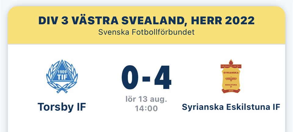 Torsby förlorade mot Syrianska Eskilstuna IF i division 3 västra Svealand herr i fotboll på Björnevi. 0-4 (0-1) slutade matchen på lördagen. – Vi startar matchen helt okej, båda lagen känner lite på varandra i värmen på Björnevi. Får 0-1 på straff emot oss, känns hårt dömd. Men 0-1 i halvtid. Vi pratar om att höja oss då vi är minst lika bra. Vi får 0-2 och en utvisning i 53:e minuten. Då får vi slita och vi orkar inte leverera den fotboll vi kan. Och tappar fokus. Låter det rinna iväg 0-3, 0-4. Vilket är olyckligt. Vi kommer igen, kommenterade Torsbys tränare Andreas Nordlander. Karwan Safari gjorde två mål, övriga mål för bortalaget gjordes av Johan Gerges och Lion Toma. Torsby har två vinster, två oavgjorda och en förlust på de senaste fem matcherna, medan Syrianska Eskilstuna IF har fyra vinster och en förlust. Det här betyder att Torsby ligger kvar på sjunde plats i tabellen. Vi tar sig an FBK Karlstad i nästa match hemma fredag 19 augusti Kl. 19:00