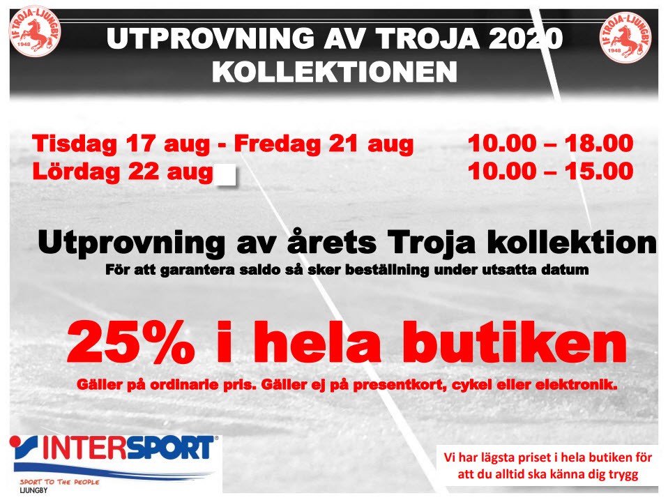 Hej, Utprovning och beställning om man vill har några trojakläder denna säsongen. V. 34 är det utprovning på intersport. Se bifogad bild.