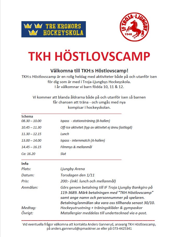 MEDLEMSAVGIFT/SPELARAVGIFT – TRE KRONOR TKH -10 o TKH -11 Som aktiv medlem i IF Troja-Ljungby måste du lösa både medlems- och spelaravgift. Spelaravgiften är fastställd till 1 000 kr, tillkommer medlemsavgift ungdom 100 kr. Avgiften är till för att täcka delar av kostnader för ishyra, mtr, funktionärskostnader, försäkringar, m.m. Vi ser gärna att ni löser medlemsavgifter för familj, ert medlemskort innefattar en mängd olika förmåner. Se mer på www.troja-ljungby.com Vid årsmötet fastställdes medlemsavgifterna till 100 kronor för ungdom 300 kronor för vuxna 500 kronor för familj (med familj menas make, maka, sambo, partner och hemmavarande barn folkbokförda på samma adress). Med ungdom avses person som under kalenderåret då verksamhetsår/räkenskapsår börjar fyller högst 20 år För att vårt medlemsregister skall bli komplett behöver vi förutom namn och adress även födelsedatum (år-månad-dag) på samtliga medlemmar, och om sådan finns, e-postadress. Inbetalning senast 10 januari till bankgiro 119-3689 Vänliga hälsningar IF Troja-Ljungby