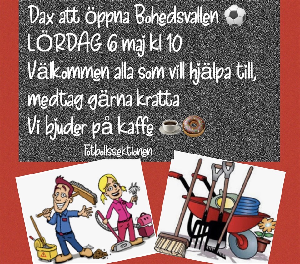 Det börjar bli dax att öppna upp Bohedsvallen igen. LÖRDAG 6 MAJ kl 10 är DU som vill hjälpa till välkommen, medtag gärna egen kratta. Vi bjuder på kaffe förståss. //fotbollssektionen Undroms IF 29 apr 2023 0kommentarer