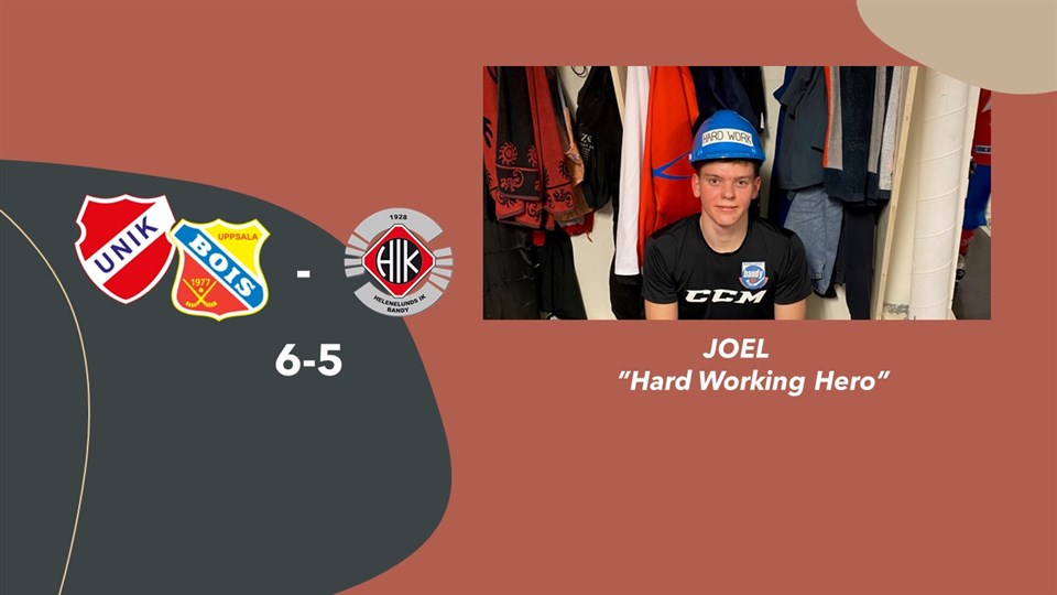Söndagen seriematch mot Helenelund slutade med hemma seger 6-5. Vi vet att matcherna mot Helenelund brukar vara jämna, täta och tuffa, likaså denna gång. Den första riktiga chansen kom i den 10e minuten då Jonathan Asplund med hög fart rann igenom och tvingade Lunden backen att fälla Jonathan med straff som resultat. Adam Askelöf satte straffen tryggt till ledning med 1-0. Matchen rullar på, dock utan något skönspel från vardera håll. Det är mest en kamp där Helenelund ligger på men vi känner oss trygga med vårt spel. Vi ökar på till 2-0 genom Hannes Kanbjer. Helenelunds kapten Rasmus Hård reducerar till 2-1 och matchen känns helt öppen. Vi får ytterligare en straff vilket leder till 3-1 ledning. Första halvlek avslutas med att Kapten Hård reducerar till 3-2 även det på straff. Vilket också blir halvtids resultat. Det känns som om första halvleken gick med lite fördel till oss.. Vi går ut till andra halvlek efter ett bra snack med intentionen att ta tag i matchen och följa vår gameplan. Det blir tvärtom och Helenelund gör 3-3. Kampen går vidare och det är tufft spel från bägge hållen. Det är en spännande match. Det skapas flera chanser från bägge lagen. När Helenelund kommer ikapp i målprotokollet så lyckas vi svara med mål så att vi kan hålla ledningen med ett mål. Vid leding 6-5 så tar Helenelund timeout (86 minuten) för att flytta fram sina positioner. Det skapar möjligheter för oss och här borde vi stängt matchen. Arvid Johansson i Helenelunds målet gör dock ett par svettiga räddningar. Helenelund trycker på i slutminuterna för att kvittera. Vi håller emot och vinner tillslut med 6-5. Det är en helt jämn match där vi drar det längsta strået denna gång. Intressant att drygt hälften av målen kommer på fasta situationer. Det vi gör bra är att vi inte förhastar oss utan lyckas med att försvara oss bra. Det vi gör mindre bra är att vi är för ojämna över tid. Vi blandar bra spel med lite för många dippar främst i andra halvlek där vi låter Helenelund ta över. Roligt att se att de nya spelarna tar för sig. Joel Zetterström blir UNIK /BOIS ”hard working hero” denna gång (bilden). Spännande också att se Helenelunds sjuttonåriga John Svanborg som visar ett moget spel. Mindre bra är att isen gick sönder med spelavbrott som följd för att laga den. Nu väntar ny träningsvecka för att kommande söndag spela match borta mot GT76 vilket blir den sista matchen före jul. Målen; Adam Askelöf 2, Hannes Kanbjer 2, Joel Zetterström 1, Jonathan Asplund 1 Assist; Adam Askelöf 2, Axel Gidlund 1 HA EN TREVLIG VECKA ÖNSKAR UNIK/BOIS