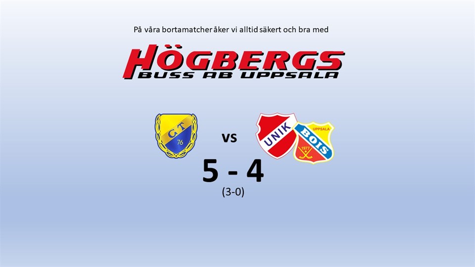 Efter två raka hemmamatcher var det dags för årets första bussresa med vår samarbetspartner HÖGBERGS BUSS. Buss till Gubbängen för match mot GT76. Med HÖGBERGS BUSS åker vi alltid tryggt och säkert vilket känns jättebra. Roligt att få spela i Gubbängens hall vilket ger bra förutsättningar. Det är två ungdomliga lag med låg medelålder som möts. GT76 har föryngrat sitt lag ordentligt sedan förra säsongen. Matchen startar lite trevande som ofta sker. GT76 tar dock ledningen efter 10 minuter. Efter 20 minuter åker vi på en fasthållning med straff till följd. GT ökar sin ledning till 2-0. Vi skapar en del hörnor och bra chanser utan att få utdelning. I stället gör GT 3-0 vilket också blir halvtidsresultat. Efter ett bra snack i halvtid går vi ut till andra med ambitionen att jobba hårt med det som vi kommit överens om och ta igen de förlorade målen från första halvlek. Trots att GT gör 4-0 känns det som om vi fortfarande kan vinna den här matchen. Efter 4-0 tar vi timeout vilket verkar göra susen. Vi knaprar oss sakta men säkert närmare i mål protokollet genom två mål av Linus Tydèn och ett av Richard Ringmar. Matchen är spännande och står verkligen och väger. Vi har chanser till kvittering men istället får GT ytterligare en straff med mål som resultat. Trots två måls underläge jobbar vi på och Hannes Kanbjer gör 5-4 på övertid. Vi kommer inte närmare utan det är bara att gratulera GT76 till segern denna gång. Positivt är att vi trots underläge jobbar hela tiden och är nära att ta ikapp. Viktor i målet spelar stabilt. Två straffar emot sig är inte att leka med. Heimer håller ihop försvaret bra. Ringblom börjar känna sig hemtam som defensiv mitt. Nu är det träningvecka som gäller innan det är dags för jul och god julmat. Vi tränar även juldagen för att förbereda oss för borta match Annandagen mot Skutskär. Efter Skutskär är det Norrtelje borta, datum 6 januari. Nästa hemma match som ni ska boka in är mot Gustavsberg lördag den 13 januari. Hoppas vi ses då. UNIK/BOIS ÖNSKAR ALLA EN RIKTIGT GOD JUL.