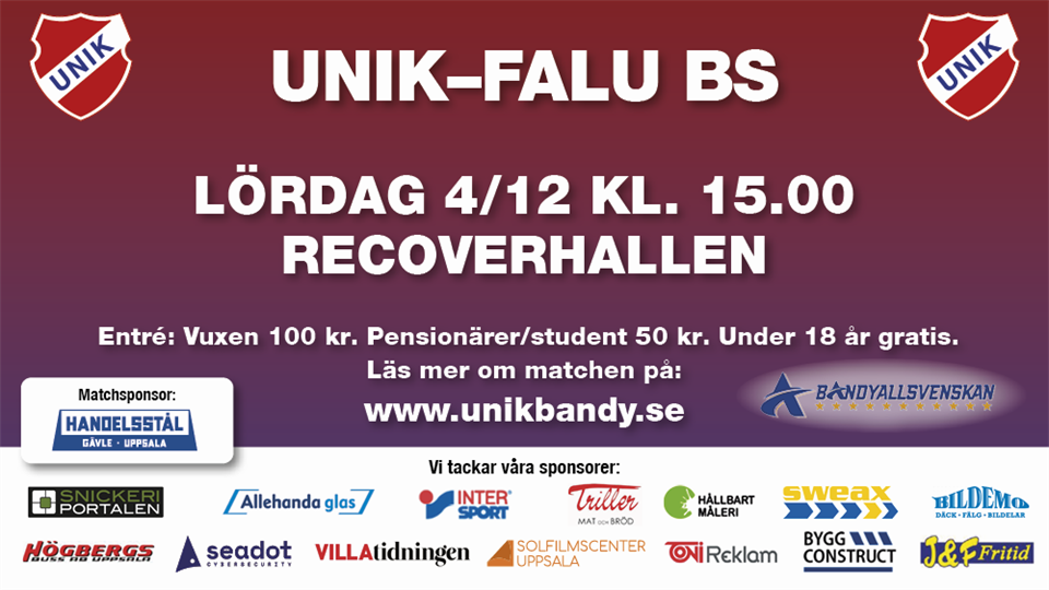 Full omgång i Bandyallsvenskan idag och UNIK tar emot Falu BS i Recoverhallen kl.15.00. Hemsidan är skyldig er ett referat från senaste bortamatchen mot Lidköpings AIK och vi kan sammanfatta den matchen via de sista 15 minuterna där UNIK pressade serietvåan ända in i kaklet men föll med 5-6. En riktigt bra insats som ger positiva signaler till dagens match. UNIK jagar första 2-poängaren och dagens match är oerhört viktig för att hänga på lagen ovanför oss i tabellen. Efter 6 omgångar börjar tabellen ta form och det är viktigt att hänga med i "rejset" och börja ta hem vinster. UNIK har hitills mött de 5 topplagen och kommer nu in i en rad matcher mot lagen runt oss i tabellen. Falu BS är ett lurigt lag att möta, lite svårbedömda denna säsong. Förra säsongens hemmamöte slutade med klar UNIK-vinst med 7-2, och genrepet inför årets serie slutade 3-3. Vi kan säkerligen räkna med en tät och jämn tillställning som förhoppningsvis slutar i Uppsalafavör. OBS! VI FÖLjER FOLkHÄLSOMYNDIGHETENS RIKTLINJER OCH KOMMER ATT KONTROLLERA COVIDPASS VID ENTRÉ TILL HALLEN.