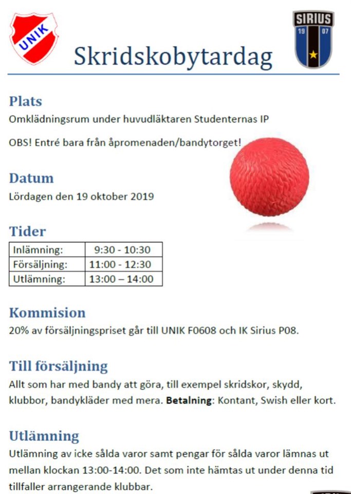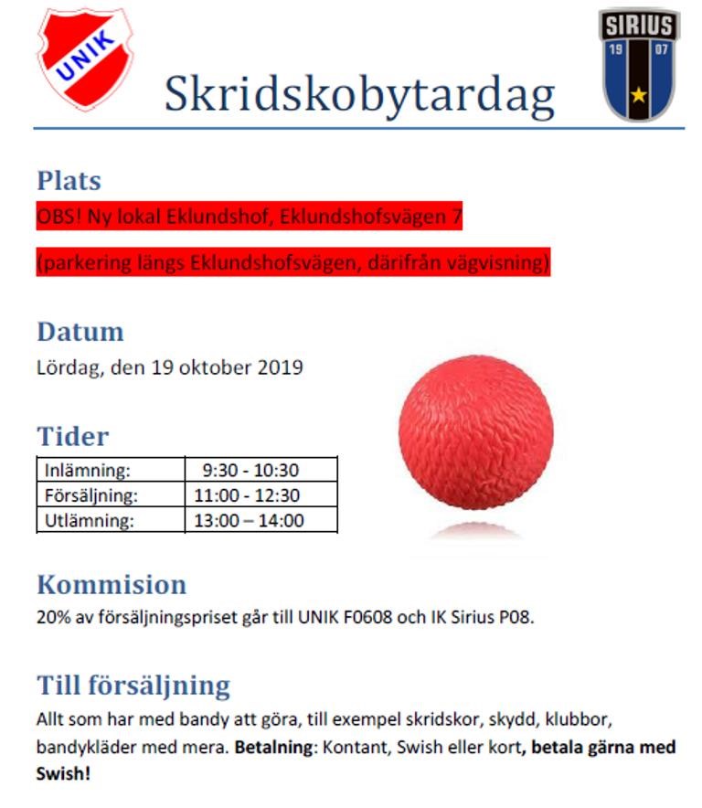 Hej, På grund av bygget nere på Studan har skridskobytardagen med kort varsel fått lov att flytta till Eklundshof (Eklundshofsvägen 7), samma tider som enligt tidigare utskick. UNIK Bandy p2007 17 okt 2019 0kommentarer