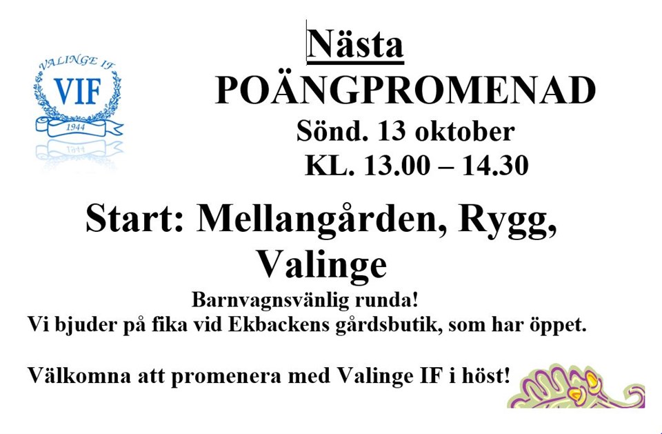 Resultat från Valinge IF:s poängpromenad, med start från Valinge by, 22 september 2024. Antal startande: 82 varav 67 vuxna och 15 barn Rätt rad vuxen: X11 121 1X1 2X2 Rätt svar vuxen: 9 st, Maria Malmer Stenergard, 1 miljon, 3 st, Sundsvall, Au, Strålrudbeckia, Visent, Kroatien, 6,26, Norge, Katka Rätt rad barn: 2X1 X21 111 X2X Rätt svar barn: Kalv, Båtsman, Halloween, Hjärta, Tomat, Struts, Rönnbär, Hallon, Danmark, 7, halv 4, Väst Skiljefråga: 107 st. Vinnare skiljefråga: Bengt Otterdahl (105) Vinnare vuxen: 1:a pris: Susanne Botsjö, Varberg (11) /142 2: pris: Carl-Erik Nilsson, Varberg (11) / 175 3:e pris: Lisbeth Holt-Busk, Veddige (11) / 177 Extrapris: Bertil Karlsson / Gerd Jagebro Vinnare barn: 1:a pris: Isak Hellström, Träslövsläge (12) / 100 2:a pris: Loui Petersson, Lindberg (12) / 131 Extrapris barn: Levi Petersson, Lindberg Vinsterna hämtas på nästa poängpromenad den 29 september från HC-bil.