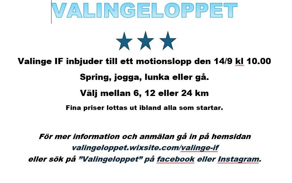 Lördagen den 14 september kör vi Valingeloppet med löpning 6,12 eller 24 km i vår vackra Valingenatur! Anmäl dig via hemsidan https://valingeloppet.wixsite.com/valinge-if. Kom igen och anmäl dig! Valinge IF 27 aug 2024 0kommentarer