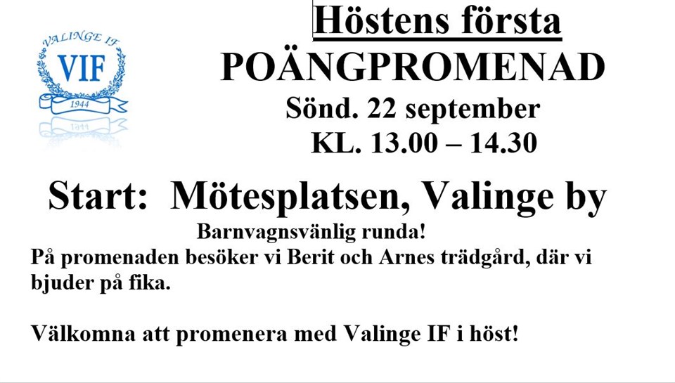 Nu är höstens poängpromenader och listan är under bearbetning, men här är inbjudan till höstens första promenad! Valinge IF 4 sep 2024 0kommentarer