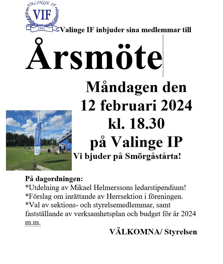 Välkomna på Valinge IF:s årsmöte måndagen den 12 februari 2024.