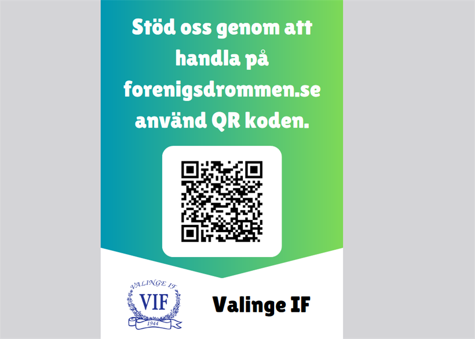 Hej, Valinge IF har inlett ett samarbete med företaget föreningsdrömmen. Genom att handla på deras hemsida så går en del av förtjänsten tillbaka till föreningen. Företaget är baserat i Hunnestad. För att kolla in sortimentet och börja handla är det enklaste att scanna den bifogade QR-koden