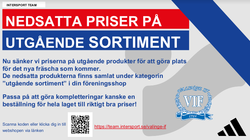 Hej, Intersport har sänkt priserna på en del träningskläder och profilkläder i vår webshop. Passa på att fynda inför jul och nästa säsong. Du hittar webshopen här! https://team.intersport.se/valinge-if/ /Jens