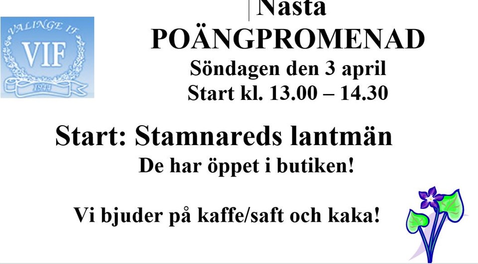 Resultat från Valinge IF:s poängpromenad, Stamnareds Lantmän 3 april 2022. Antal startande: 122 vuxna och 26 barn Rätt rad vuxen: 21x, 1xx, 1x2, 2x1. Fjäril, Minnet, 374, Pion, Blå, 603 000 km2 Charlotte Kalla, 3, Påve, Återvunnet, Säljer läromedel, Bruket. Rätt rad junior: x11, 21x, x1x, 221. Möss, Elefant, Huvud, Klövar, Danmark, Gul och blå, Påsk, Svala, Grön, Sekatör, Vitsippa, Innebandy. Skiljefråga: 32.80 m Vinnare skiljefråga: Svante Jönsson Smålandsgatan 69, 32,5 m Vinnare seniorer: 1:a pris: Helen Gunnarsson Ugglarp Rolfstorp 12 r, 31,2 m 2:a pris: Anethe Åkerlind Eskilsgatan 34b, Varberg 12 r, 26,5 m 3:e pris: Bo Nilsson Lundby 14, 12 r, 25,1 m Extrapris: Ingemar Eriksson Sveadal, Valinge, Bönarp Birgitta Karlsson Almebergsgatan 20, Varberg Christina Karlsson Valinge by 43 Vinnare junior: 1.a pris: Sixten Otterdahl Valinge, 12 r 31,63 2:a pris: Frans Anthav 12 r 31,50 m 3:e pris: Rasmus Eriksson Valinge Bönarp 6 12 r 35,64 Extrapris : Märta Persson Valinge, Grunnarp 12 Selma Gunnarsson Söderhöjd Ellie Svensson Saxvägen 2, Varberg Vinsterna kan hämtas på nästa promenad från Tångaberg, Balgövägen 35, den 10 april 2022