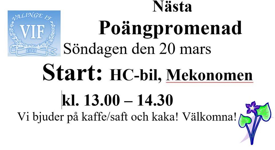 Här kommer nu hela lista över vårens poängpromenader i Valinge med omnejd! VALINGE IF´s POÄNGPROMENADER VÅREN 2022 Dag Tid Plats 13/3 13.00-14.30 Valinge IP, Barnvagnsvänlig Vägv. väg Lindberg-Valinge 20/3 13.00-14.30 HC-bil/Mekonomen Vägv. väg Valinge k:a-Derome 27/3 13.00-14.30 Anders o Cecilia Toarp 3, Valinge Vägv.: Valinge k:a-Skällinge 4H ordnar Toarps skafferi har öppet för försäljning! 3/4 13.00-14.30 Stamnareds lantmän, Öppet i butiken! Vägv. v. Lindberg- Stamnared 10/4 13.00-14.30 Tångaberg, Balgövägen 35 arrangeras av Lindberga Hembygdsförening 17/4 12.30-14.30 Påskpromenad, Mellangården,Rygg Valinge bygdelag Barnvagnsvänlig Vägv. väg Valinge K:a-Derome 24/4 13.00-14.30 Mötesplatsen, Valinge by, Barnvagnsvänlig 1/5 13.00-14.30 Kalkladan, Olofstorp Vägv. Valinge k:a 8/5 13.00-14.30 Lindbergs skola, Barnvagnsvänlig 15/5 13.00-14.30 Stamnareds Handelsträdgård Vägv. väg Lindberg-Stamnared 22/5 13.00-14.30 Derome skola, Barnvagnsvänlig Valinge-Derome DFF ordnar Vi bjuder på kaffe/saft o kaka ute på banan! Ev. kan flera banor vara Barnvagnsvänliga kolla med arrangören! Även I vår vill vi premiera våra trogna promenerare, så de som går minst 4 av vårens promenader deltar i utlottningen av två Presentkort hos ICA-nära, Rolfstorp. Lotter finns att köpa på promenaderna. Det finns swish för betalning! Promenaderna finns införda Laget.se/Valinge IF och Valinge IF:s Facebook, där du även kan läsa resultatet från promenaderna! www.Laget.se/Valinge IF
