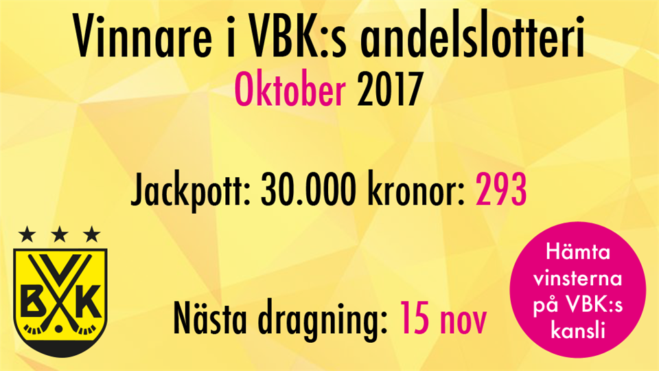 Dragning i VBK:s andelslotteri för oktober 2017 - en månad med jackpott på 30 000 kr. Dragningslista oktober: Jackpott 30 000:-, lottnummer 293 Vinnaren ombedes kontakta kansliet, 0383-138 38. Lotterikontrollant: Sven-Inge Wärnsved. Vi reserverar oss för eventuella felskrivningar. STORT GRATTIS! Nästa dragning sker den 15 november. Köp din lott inför nya året nu, kontakta kansliet på 0383-138 38 eller info@vetlandabk.se.