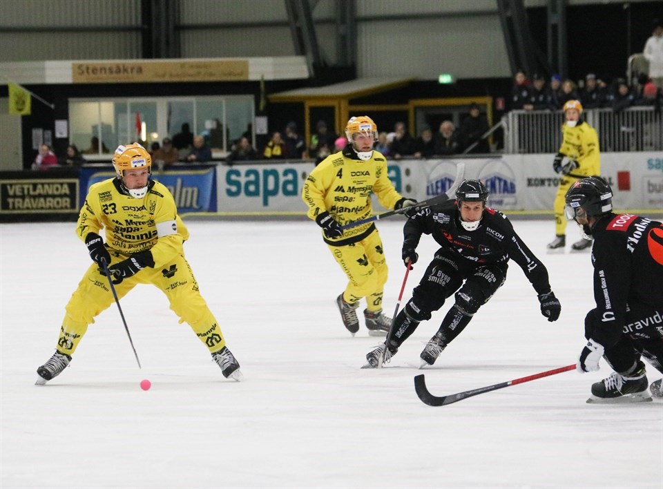 Vetlanda BK – IK Tellus 14-4 (6-3) Målskyttar VBK: Joakim Andersson 5, Filip Bringe 3, Tobias Nyberg 2, Johan Löfstedt 2, Daniel Johansson , Pontus Blomberg Målskyttar Tellus: Aksel Örn Ekblom, Martin Deacon, Niklas Westblad, Fredrik Larsson. Hörnor: 5-7 Utv: VBK 2x10, Tellus 2x10 Publik: 741Matchrapport VBK besegrade Tellus med 14-4 och fick förutom två viktiga poäng med sig en väsentligt förbättrad målskillnad från denna söndagseftermiddag då 741 personer letat sig till Sapa Arena. Matchen inleddes något trevande, men publiken fick ändå se nio mål i första halvlek, varav några frukten av dåligt försvarsspel, andra värda entrépengen och lite därtill. De nio målen fördelade sig så, att VBK gjorde 6 och Tellus 3. Mest minnesvärt av dessa nio, var när Joakim Andersson först åkte sig ren, tog ner Blombergs lyft, jonglerade några gånger och sedan lobbade in 1-0 bakom Kimmo Kyllönen. Men även Jockes andra mål, där han på innebandyvis stillstående dribblade med Tellusförsvaret och avslutade med ett dragskott, och Filip Bringes volleyskott efter Johan Löfstedts frislagslyft som ledda fram till 4-2 var vackra. Direkt i andra halvlek reducerade Tellus till 4-6, men därefter var det VBK för hela slanten. Utan pardon åkte de gula gång på gång igenom ett allt mer uppgivet bortaförsvar. När domaren blåste av, hade VBK alltså hunnit med att göra 14 mål, varav Joakim Andersson gjorde fem och Filip Bringe tre. Storseger för VBK, men ändå inte i nivå med de segrar med 13-0 som tagits mot Karlstad Göta (1986, borta), Kungälv (1988, hemma), och Derby (2005, hemma). Härnäst väntar bortamatch i Västerås, på onsdag mot Tillberga. Nästa hemmamatch är på fredag den 13 januari, då Villa kommer på besök och våra sponsorer bjuder på entrén.