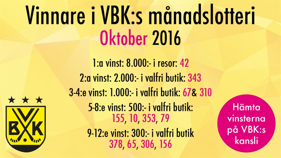 Vi har haft dragning på VBK:s månadslotteri för oktober 2016 och följande nummer har utfallit med vinst. Följande lottnummer har utfallit med vinst i september 2016 1) 42. 2) 343. 3-4) 67, 310. 5-8) 155, 10, 353, 79. 9-12) 378, 65, 306, 156. Reservation för ev felskriviningar. Vinstplan varje månad 1:a vinst: 8.000:- i resor 2:a vinst: 2.000:- i valfri butik 3-4:e vinst: 1.000:- i valfri butik 5-8:e vinst: 500:- i valfri butik 9-12:e vinst: 300:- i valfri butik Köp din lott nu: Ny period i månadslotteriet - laddat med nya rabatter