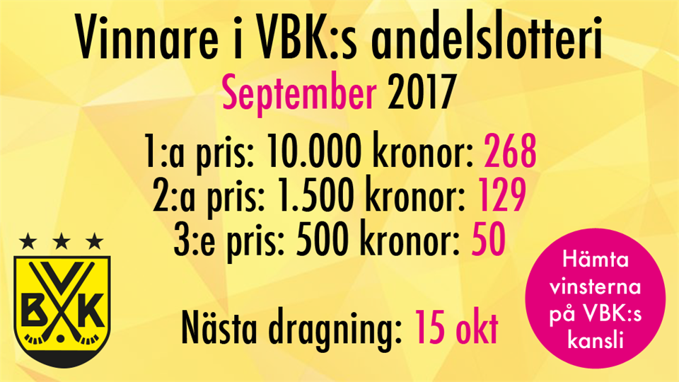 Dragning i VBK:s andelslotteri för september. Se vinnarna här! Dragningslista september: 1:a pris 10.000:-, lottnummer 268 2:a pris 1.500:-, lottnummer 129 3:e pris 500:-, lottnummer 50 Vinnaren ombedes kontakta kansliet, 0383-138 38. Lotterikontrollant: Sven-Inge Wärnsved. Vi reserverar oss för eventuella felskrivningar. STORT GRATTIS! Nästa dragning sker den 15 oktober, då det är jackpott och en ensam vinnare vinner 30 000 kr. Du har chansen att vara med i dragningen - helt utan kostnad. Om du går med som ny lottinnehavare på en av våra lediga andelar för november 2017 - oktober 2018 läggs du utan kostnad till i dragningen redan i oktober 2017. Läs mer om hur du går med här!