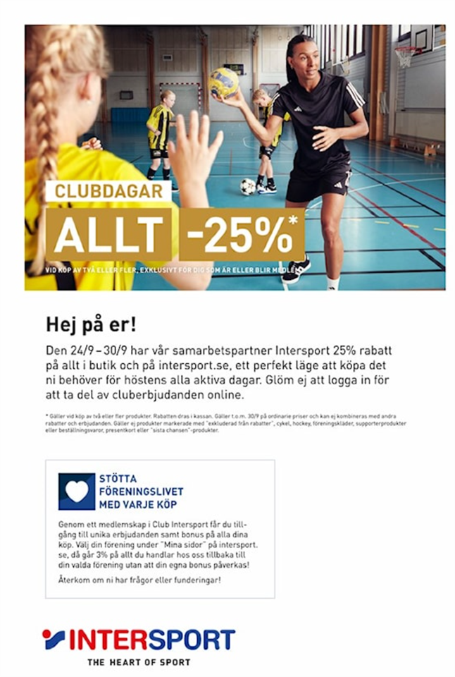Mellan den 24/9–30/9 har vår samarbetspartner INTERSPORT 25% rabatt på allt i butik och på intersport.se, ett perfekt läge att köpa det ni behöver för höstens alla aktiva dagar. Gäller för dig som är eller blir medlem i Club INTERSPORT. Glöm ej att logga in för att ta del av cluberbjudanden online. Genom ett medlemskap i Club INTERSPORT får du tillgång till unika erbjudanden samt bonus på alla dina köp. Välj din förening under ”Mina sidor” på intersport.se, då går 3% på allt du handlar hos oss tillbaka till din valda förening utan att din egna bonus påverkas!