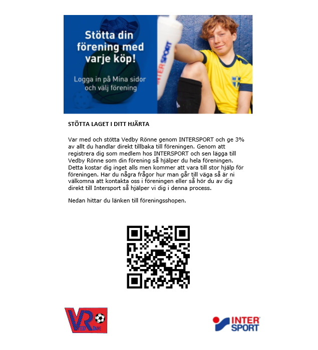Nu är klubbshoppen på Intersport redo! Alla kan därmed redan nu beställa sin VR utrustning för 2024! Vi har utökat sortimentet rejält med nya VR artiklar.Genom vårt avtal får Vedby Rönne kick back på allt som handlas i klubbshoppen. Vedby Rönne får även kick back på allt annat man handlar på Intersport. Det enda ni behöver göra är att registrera Vedby Rönne som klubb på ”mina sidor” på Intersport.se Välkommen in och beställ fantastiskt fina fotbollskläder och stötta samtidigt årets förening i Klippans kommun! Du hittar klubbshoppen via länken nedan eller genom att scanna qr koden. Länk till klubbshoppen: Klubbshop-Intersport P-11/12 7 feb 2024 0kommentarer