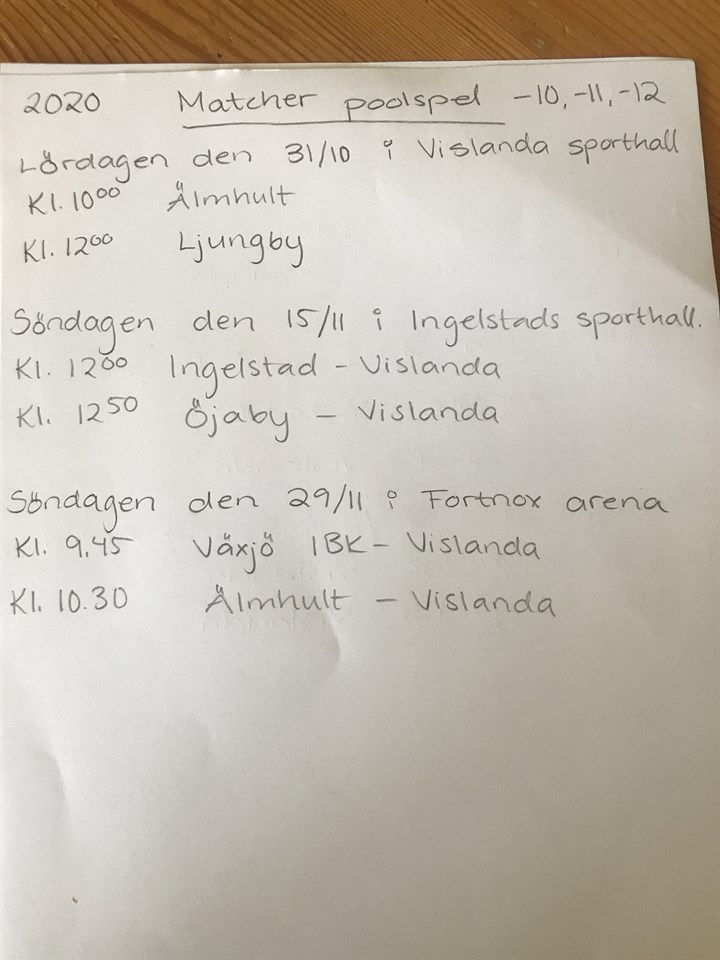 Här kommer en bild på alla kommande matcher som laget har. Tider för samling och vad som gäller kring publik kommer inför varje datum. Vet man redan nu att mitt barn inte kan spela så framför det snarast till ledarna! Barnen som är födda -12 kommer även spela med det yngre laget. Första matchen med de yngre laget är söndagen den 1/11 i Ingelstads sporthall, första matchen spelas kl.12.00. Med vänlig hälsning, Ledarna