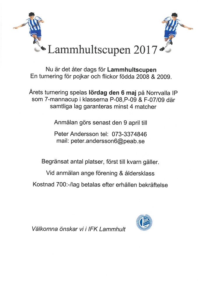 Lördagen den 6-maj spelar vi i P07/08 Lammhultscupen. Det kommer bli minst 4 matcher. Mer information kommer i mitten av april.