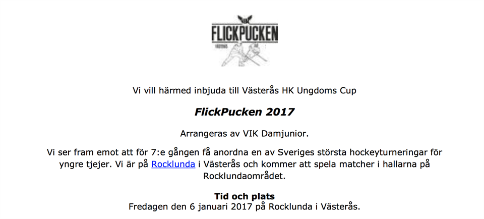 Den 6 januari arrangerar vi Flickpucken för sjunde året i rad. Målgruppen för i år är 01-04. På cup online hittar ni mer information om denna populära cup. Dam 7 nov 2016 0kommentarer